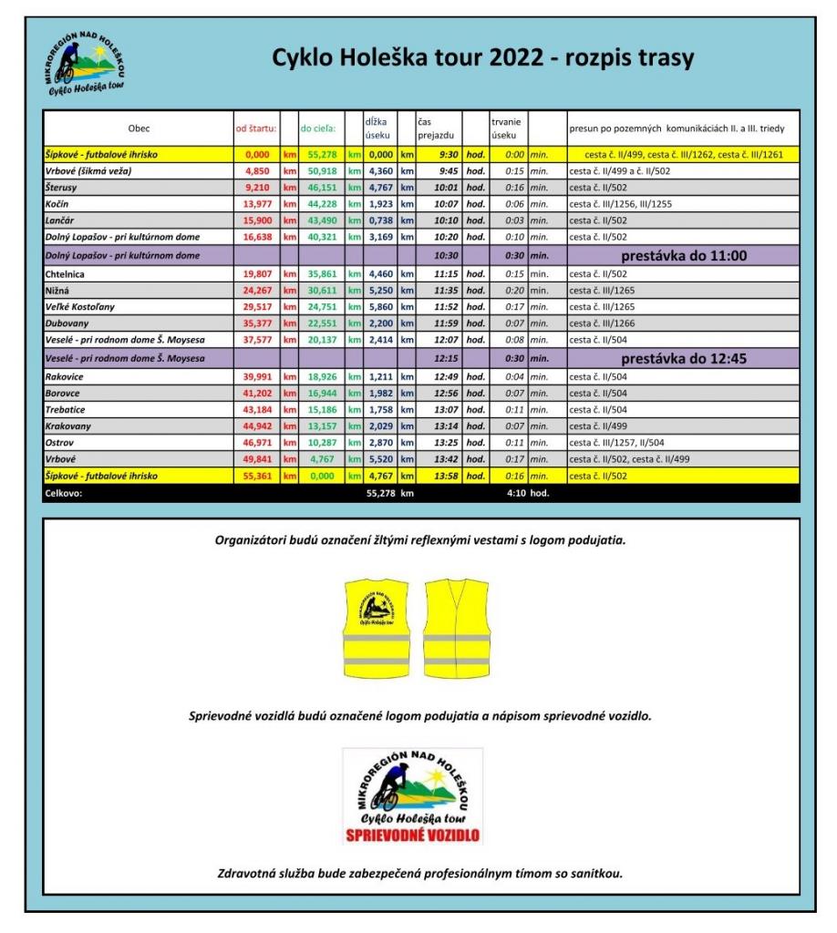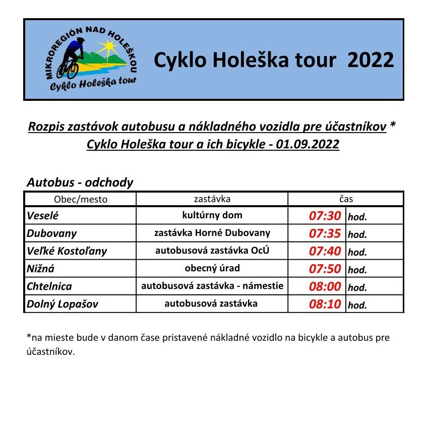 Ráno v deň konania Cyklo Holeška tour bude k dispozícii autobus na zvezenie účastníkov aj s bicyklami. Z dôvodu uzáveru mosta medzi obcami Veselé a Rakovice, bude trasa autobusu podľa priloženého rozpisu z obcí: